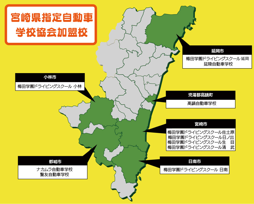 宮崎県内には宮崎県公安委員会の指定を受けた会員指定自動車教習所が11校あります。会員指定自動車教習所の学校名、所在地、教習の免許種別等はトップページの「宮崎県指定自動車学校協会加盟校リンク」からクリックしてください。